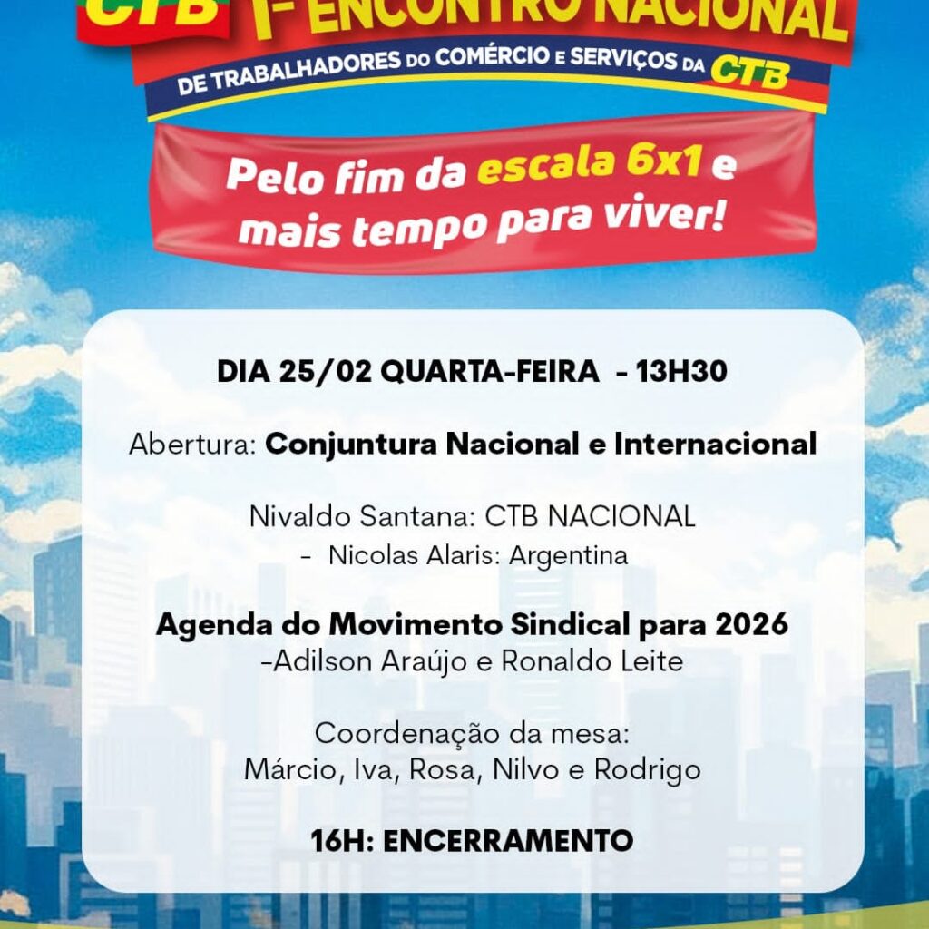 Aproximadamente 150 dirigentes sindicais de todo o país estarão reunidos nos dias 25,26 e 27 de fevereiro em Caxias do Sul para participar do 1º Encontro Nacional de Trabalhadores de Comércio e Serviços da Central dos Trabalhadores e Trabalhadoras do Brasil – CTB. O evento, que acontecerá no auditório do Sindicomerciários Caxias, contará com 17 debatedores e 8 temas de discussão, sendo um dos principais temas o FIM DA ESCALA 6X1, POR MAIS VIDA ALÉM DO TRABALHO.